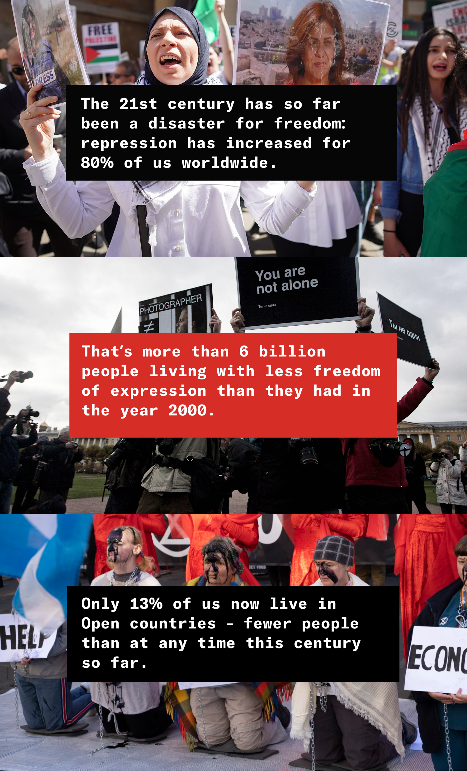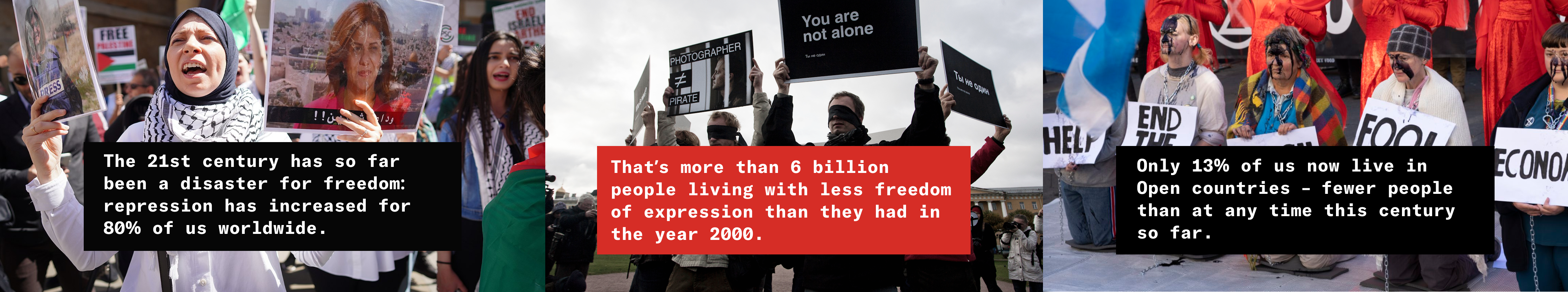 These threats are posed not just by autocratic governments, but also by legislation and law enforcement within democratic structures that erode the enjoyment of human rights, as well as by corporate interests and organised crime. Where those groups and their interests overlap, freedoms are in acute danger.